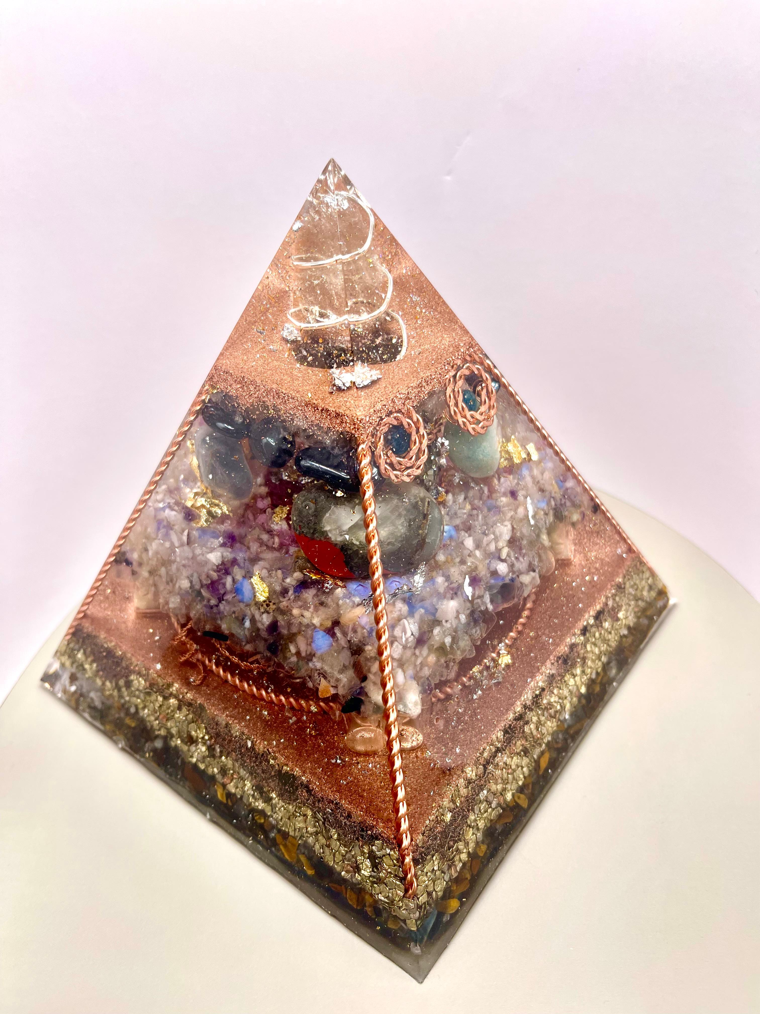 Această creație conține foiță de aur și foiță de argint, spirale energetice din cupru și o selecție atent aleasă de cristale naturale: cuart fumuriu, cuart transparent, hematit, piatra Sânge de Dragon, apatit albastru, amazonit, ochi de tigru, opal, ametist, labradorit, fluorit și cuart trandafiriu. Împreună, aceste elemente creează o structură coerentă care amplifică fluxul energetic, stabilizează câmpul subtil și susține armonizarea profundă a spațiului și a ființei.