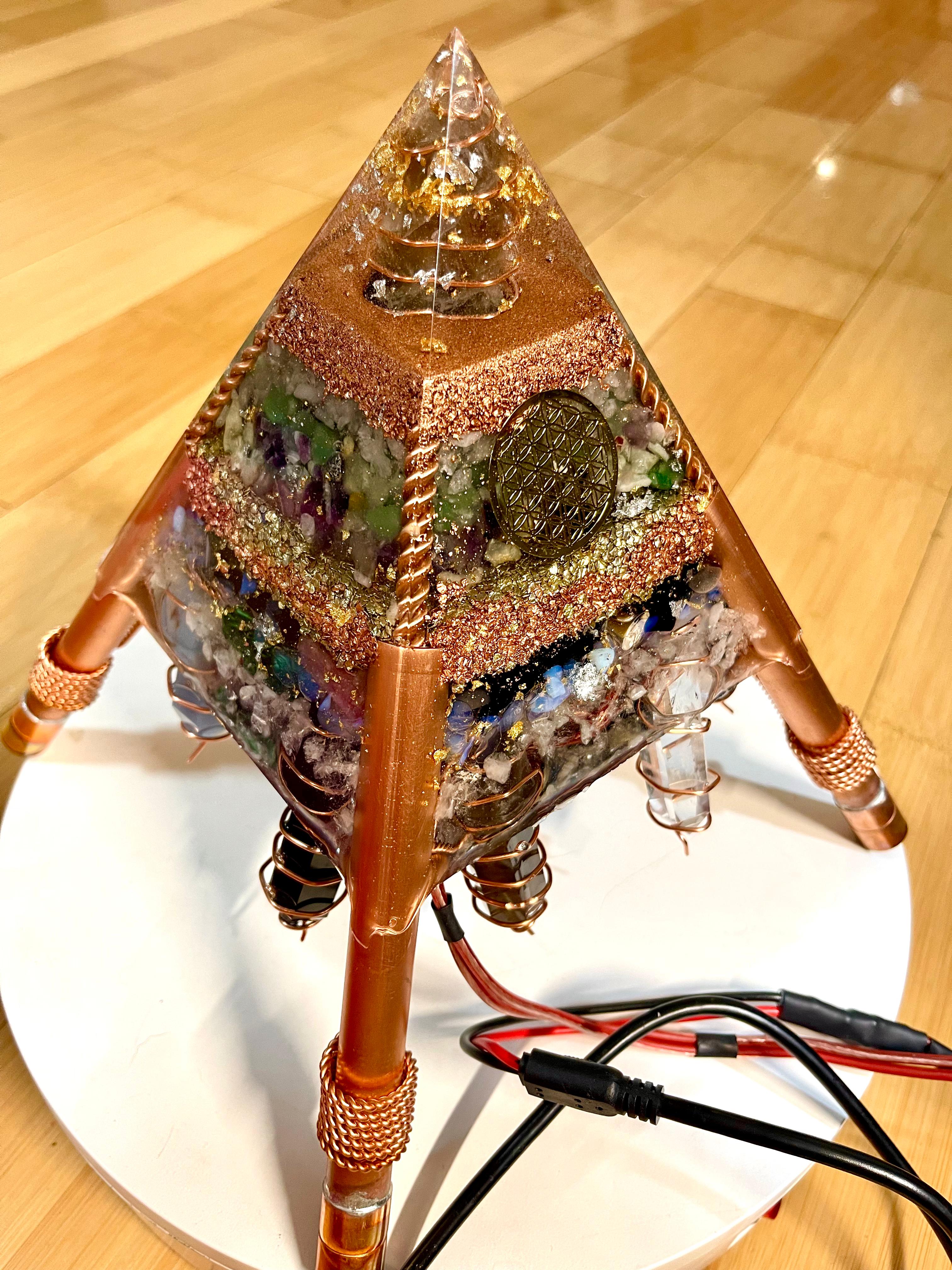 Structura piramidei este realizată din țevi de cupru, iar colțurile sunt create din rășină specială cu cupru și cristale, dispuse echilibrat: