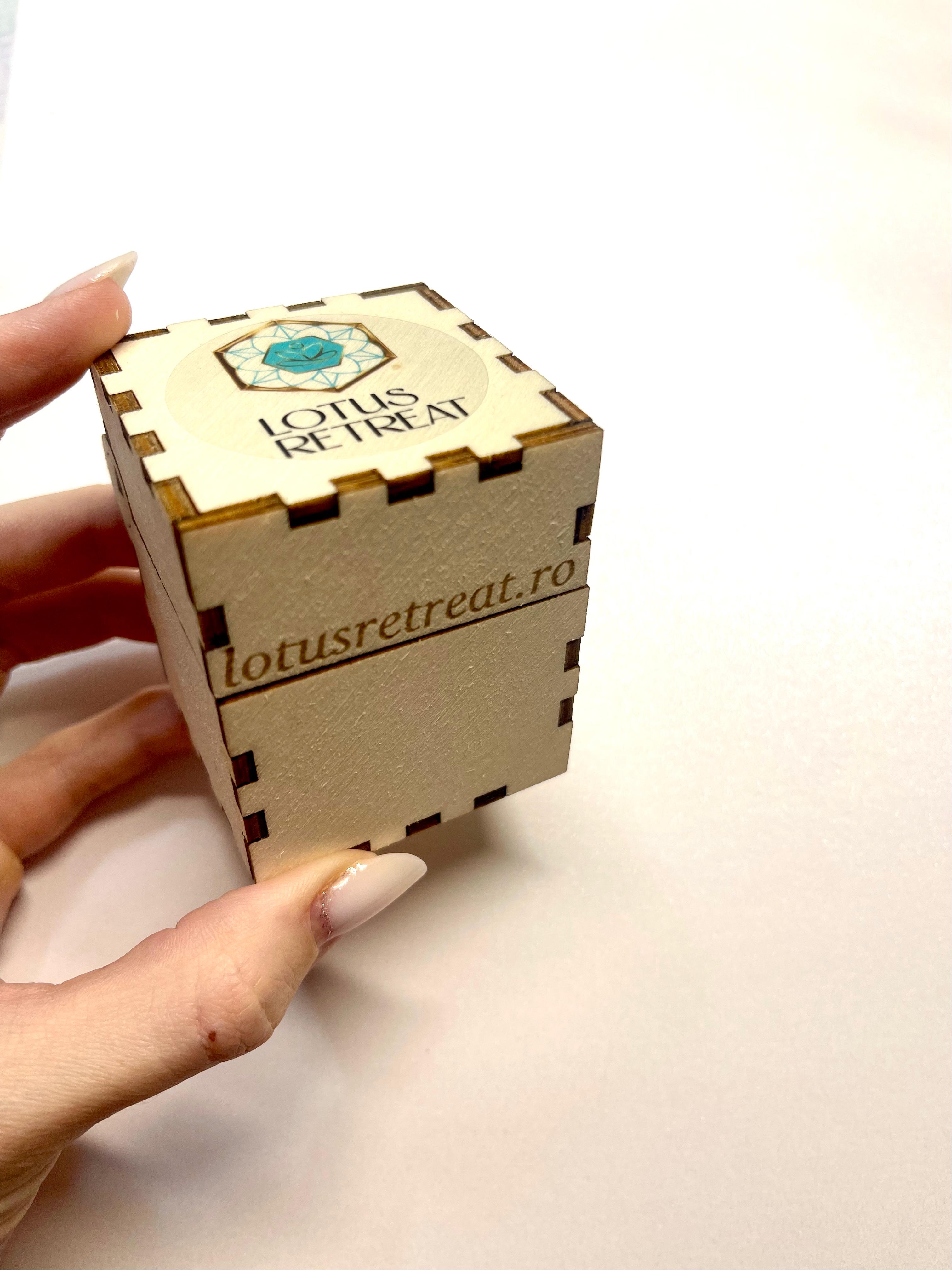 Fiecare pandantiv este livrat într-o cutiuță din lemn natural, simplă și elegantă, potrivită atât pentru păstrarea lui într-un spațiu dedicat, cât și pentru a fi oferit cadou. Cutiuța protejează talismanul și îi oferă un loc de odihnă atunci când nu este purtat.