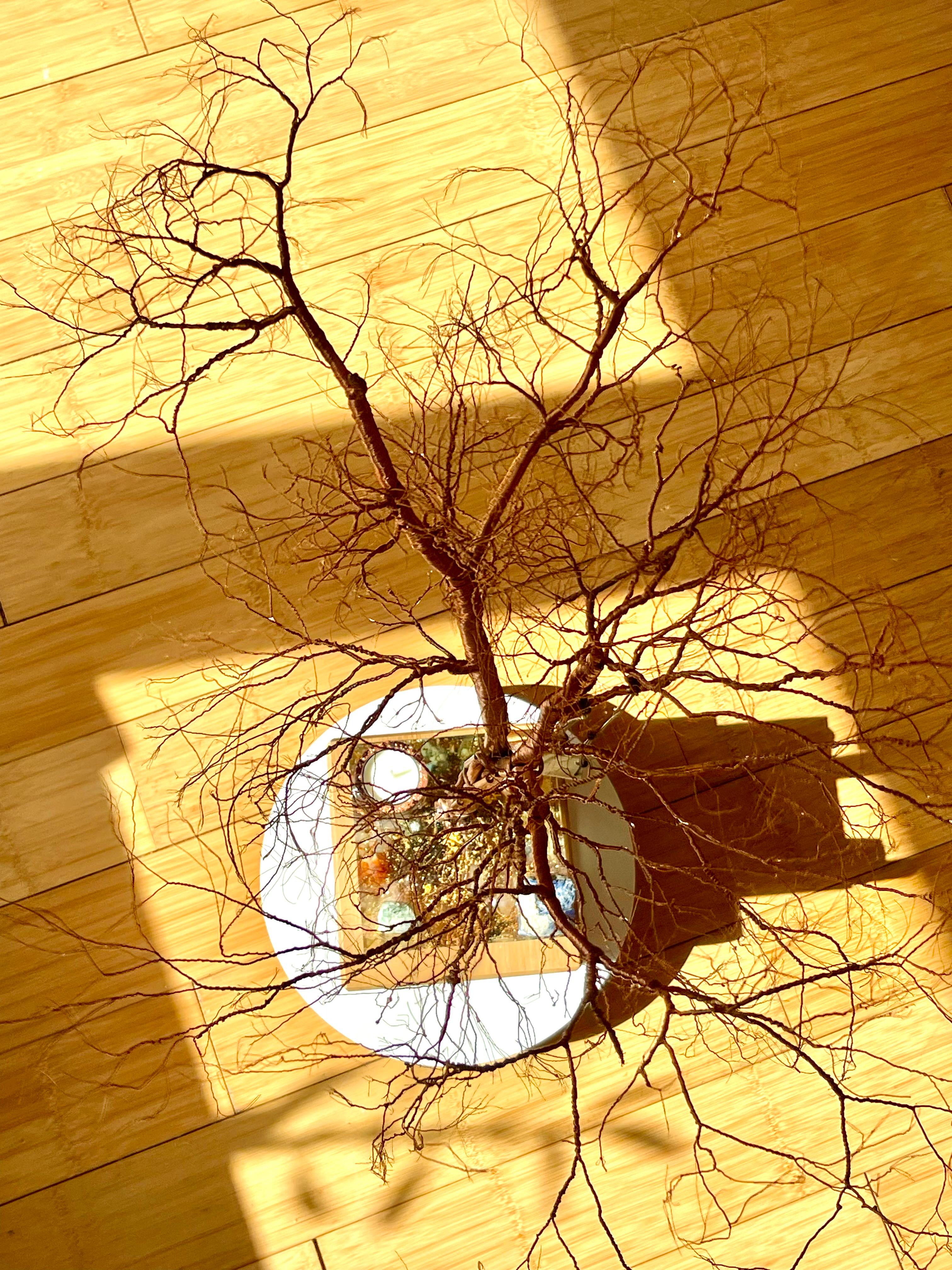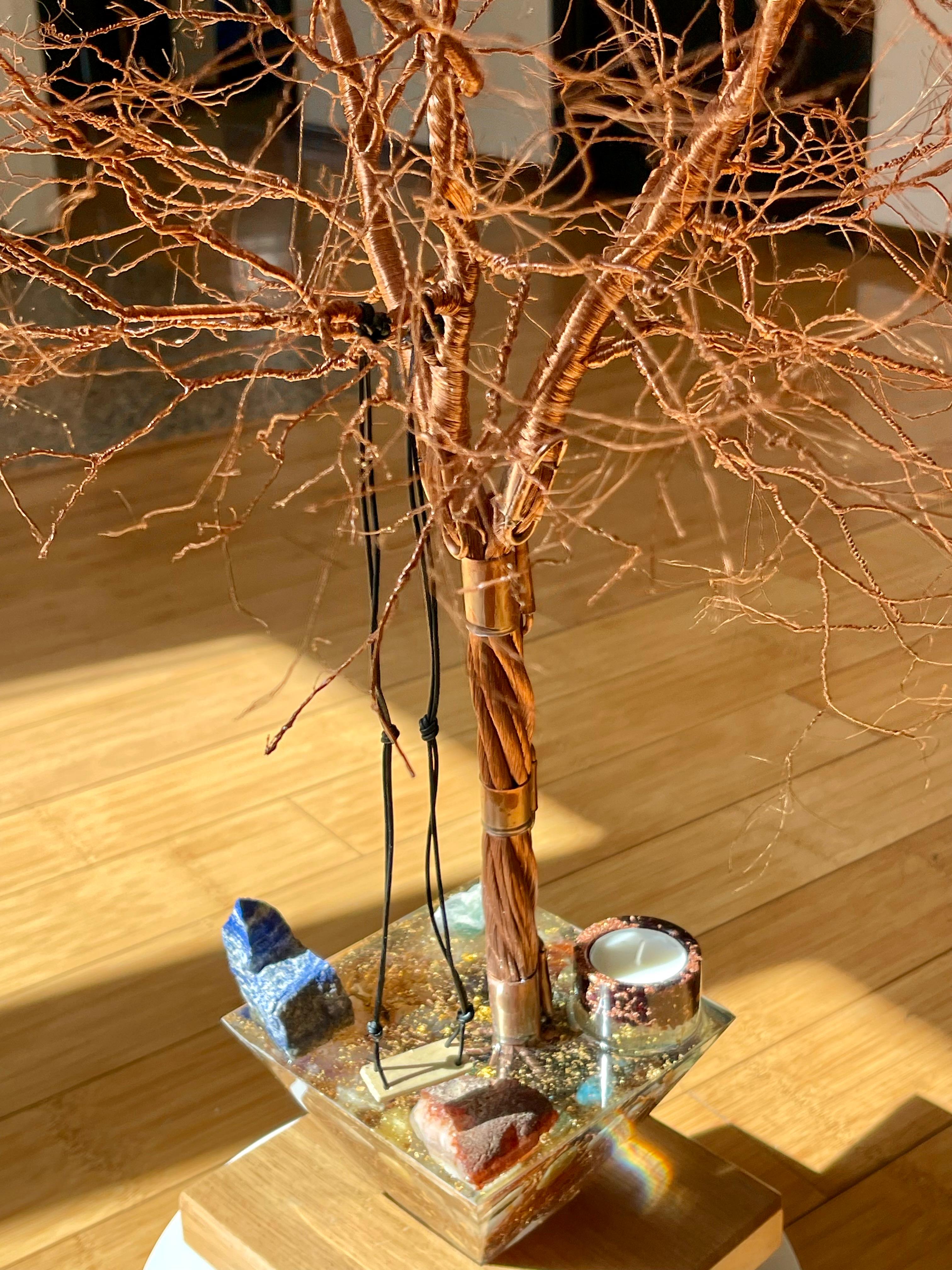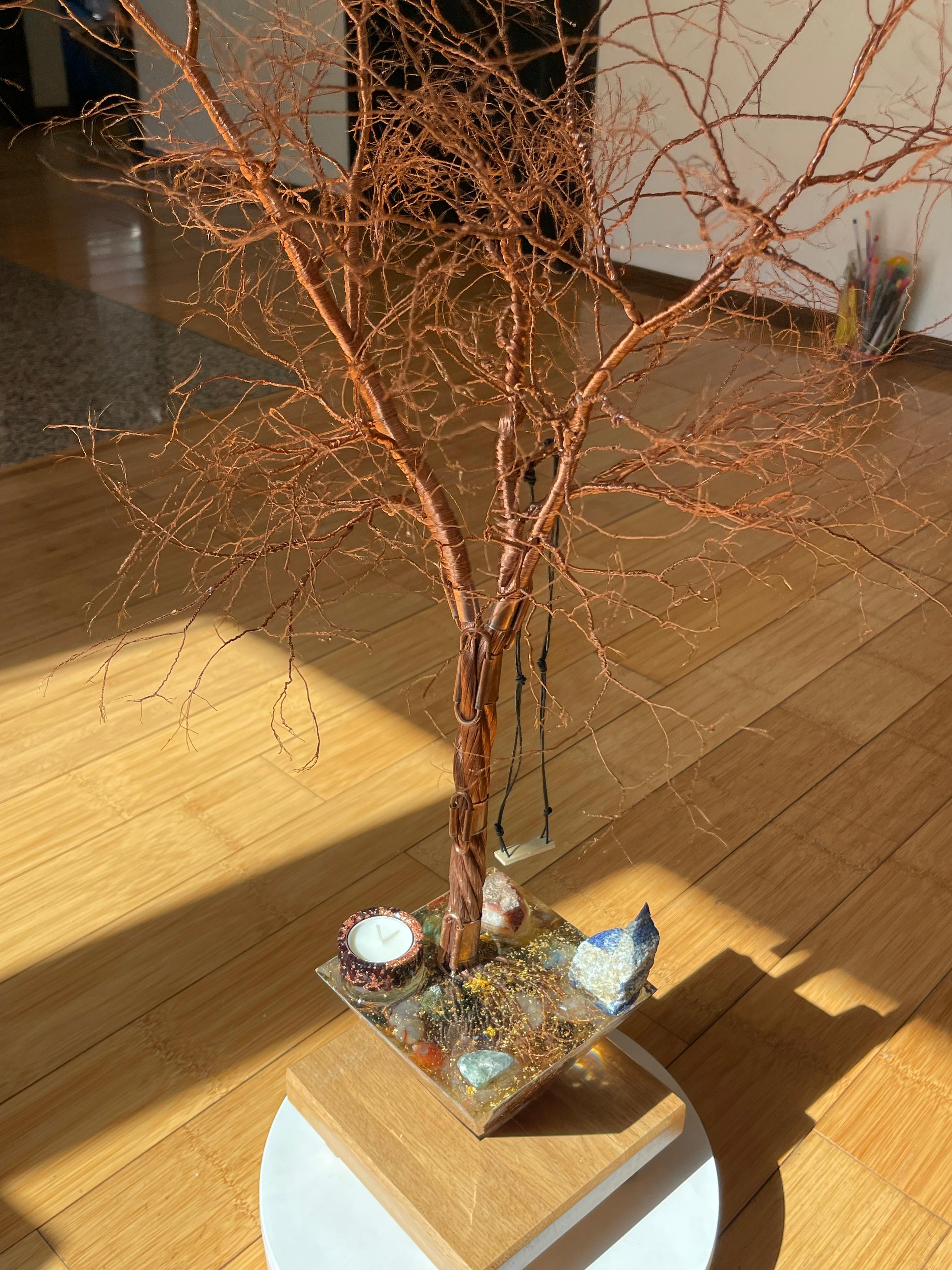 Am creat acest copac dintr-un dor tainic – dorul de leagănul copilăriei, de râsul sincer și de zilele în care timpul nu conta. Un copac născut din cupru, dar crescut cu iubire. Fiecare ramură poartă vibrația amintirilor noastre curate, a momentelor în care ne simțeam în siguranță, acolo unde inima era întreagă.