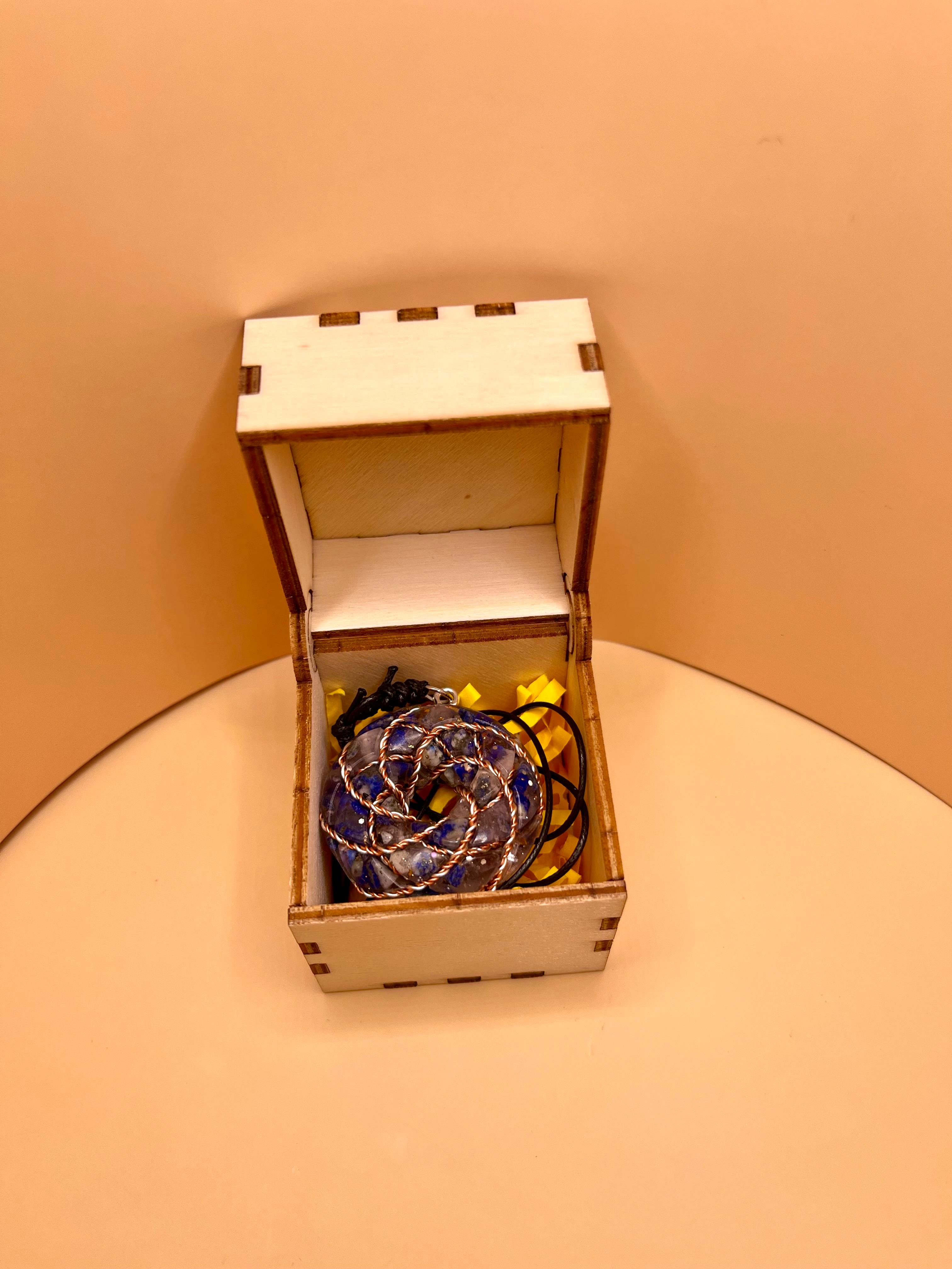 Realizat manual, bobinat cu fir de cupru argintat și integrând un inel tensor de 177 MHz, pandantivul este montat pe șnur cerat rezistent și livrat într-o cutie din lemn, accentuând caracterul său artizanal și conexiunea cu elementele naturale.