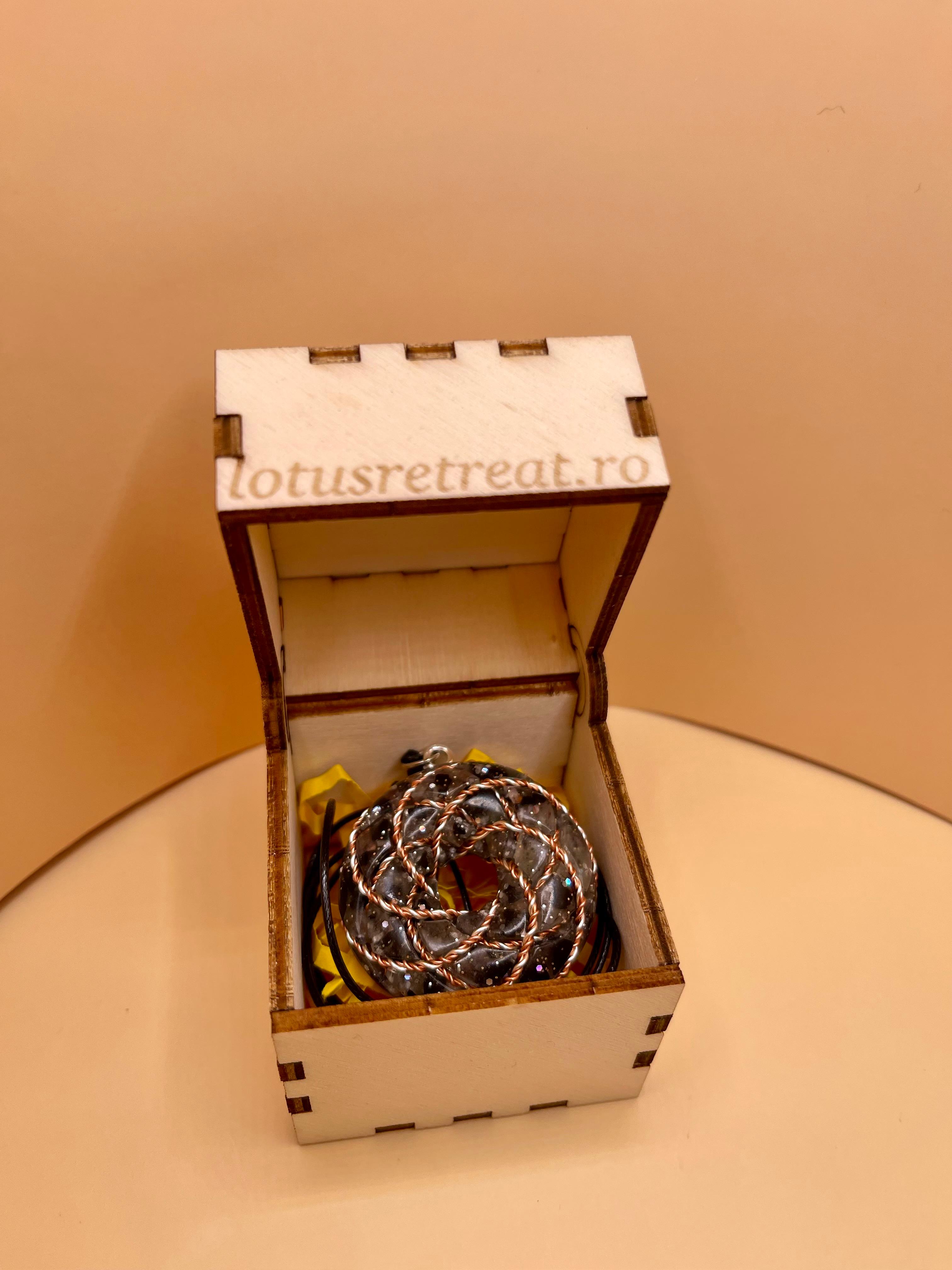 Realizat manual, pandantivul este bobinat cu o combinație de cupru și cupru argintat, integrând un inel tensor de 177 MHz. Este montat pe șnur cerat rezistent și livrat într-o cutie din lemn, evidențiind caracterul său artizanal și conexiunea cu energia pământului.