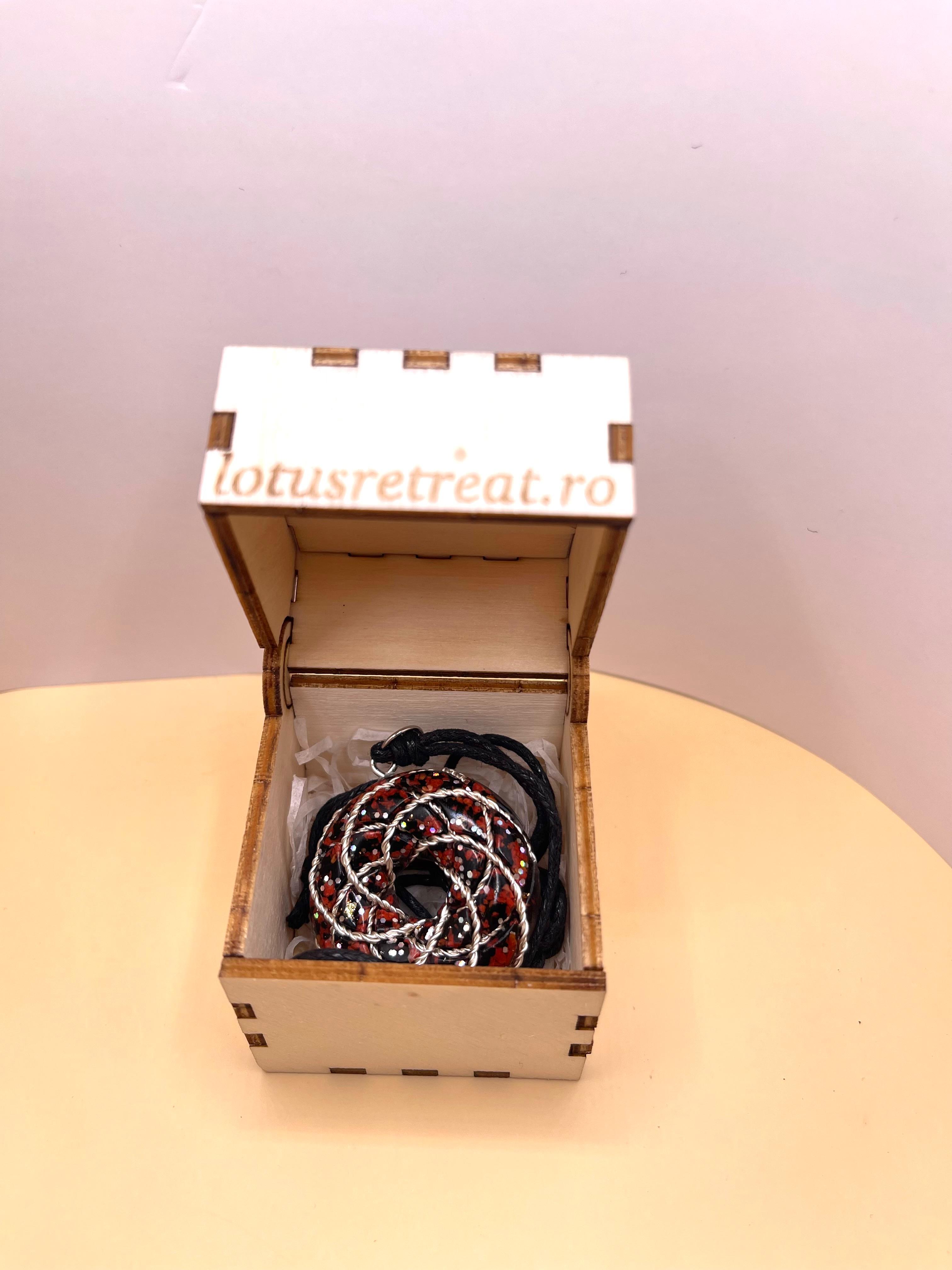 Realizat manual, bobinat cu fir de cupru argintat, integrând un inel tensor de 177 MHz, pandantivul vine montat pe șnur cerat rezistent și este livrat într-o cutie din lemn, accentuând legătura cu elementele pământului.