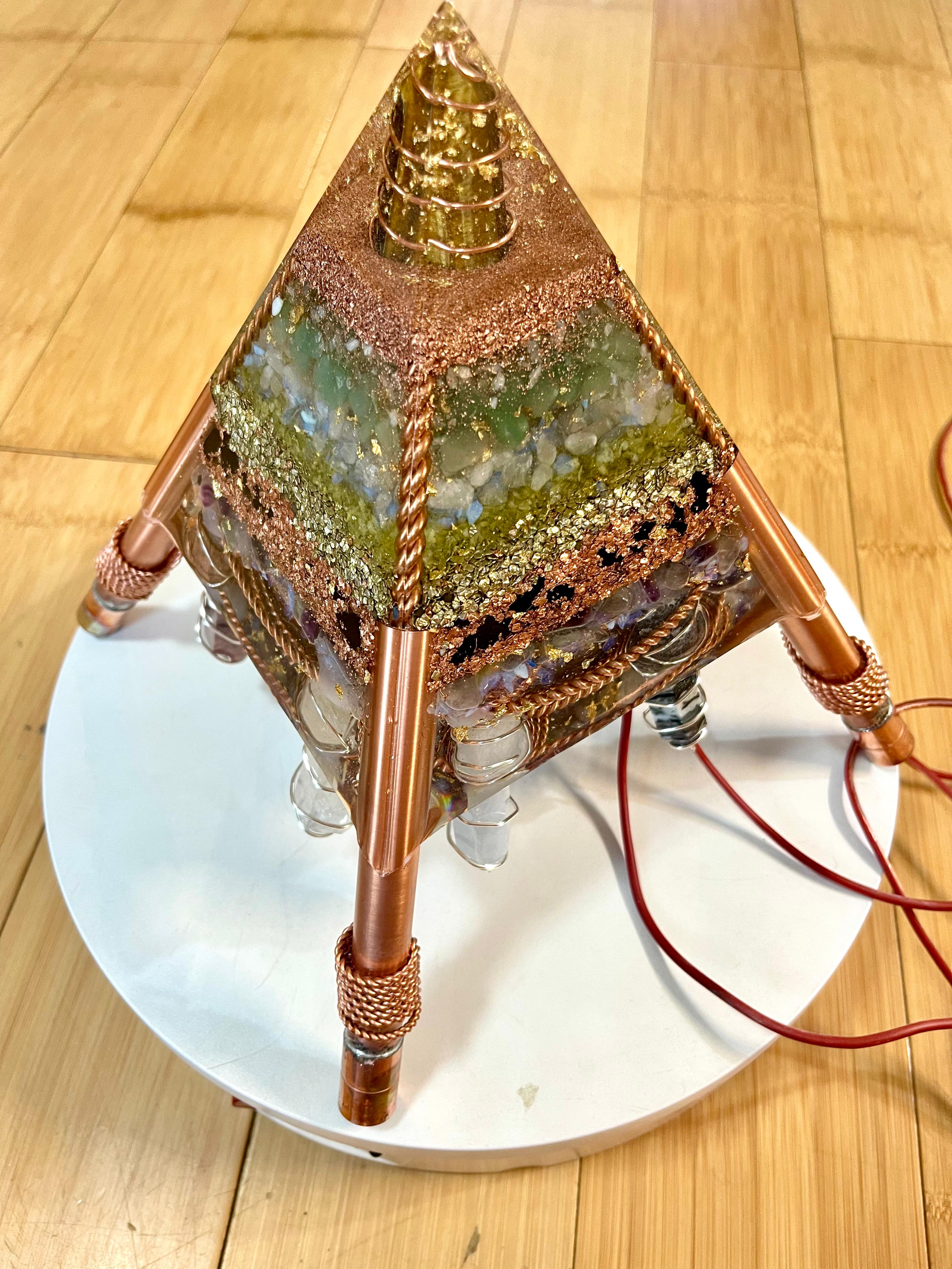 La vârful piramidei se află un orgon complex, care combină structura clasică de orgonit cu tehnologia Tensor, GANS și Nanoplante, creând un instrument puternic pentru echilibrarea și amplificarea fluxurilor de energie subtilă.