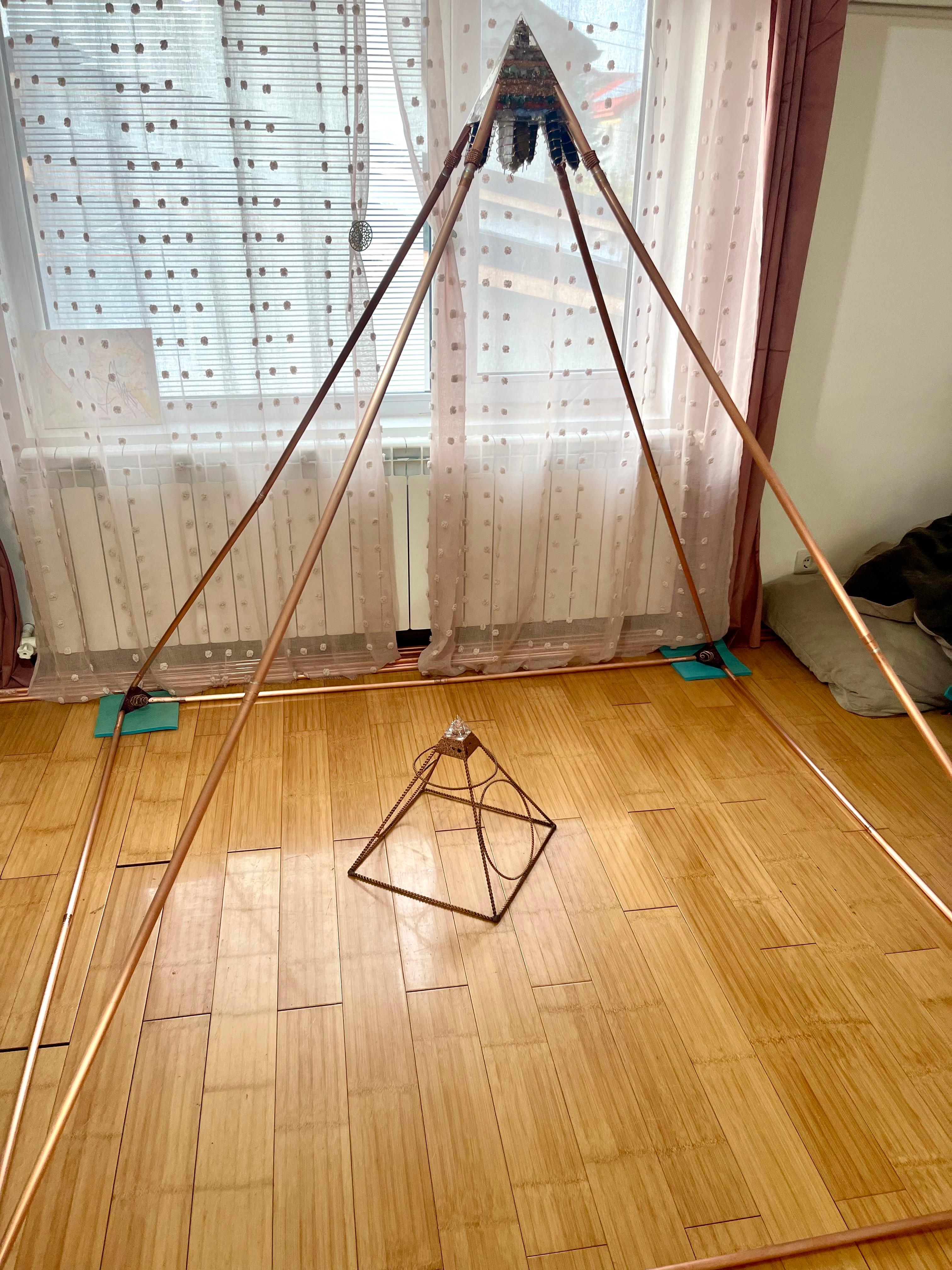 Piramida are o înălțime de aproximativ 1,60 – 1,70 m, fiind realizată din țevi de cupru care creează un câmp electromagnetic natural de aliniere cu energiile Pământului și ale Cerului. Colțurile sunt turnate dintr-un amestec de rășină, cupru și citrin, iar în centrul ei se află un orgon de mari dimensiuni, încărcat cu o combinație unică de metale, pietre și tehnologii subtile.