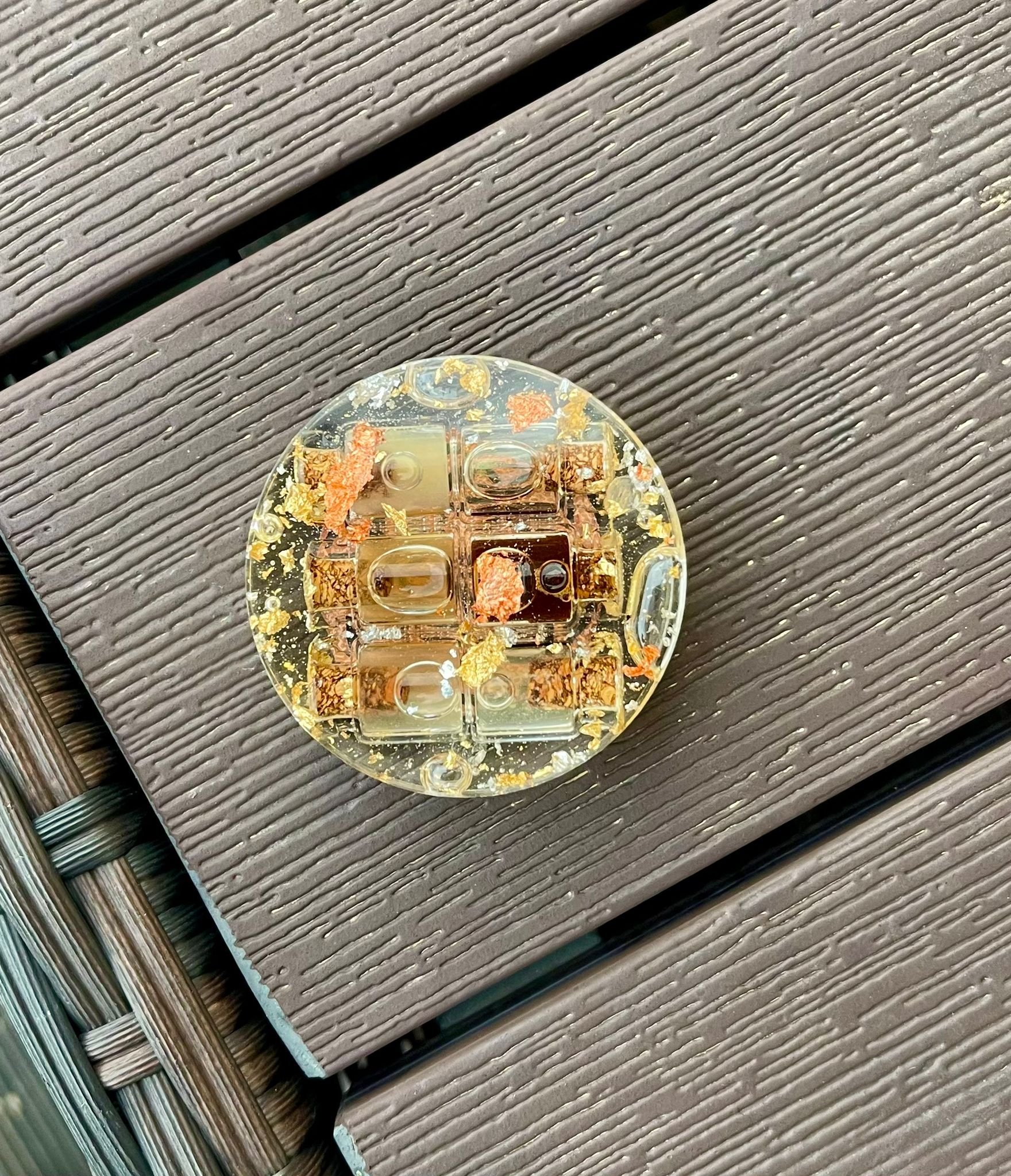 Realizat din rășină transparentă, cu inserții delicate de foiță de aur și argint, talismanul concentrează și amplifică energiile subtile ale celor 6 fiole energetice integrate în interior. Forma lui rotundă îl face ușor de purtat, fie în portofel, fie ca pandantiv (poate fi personalizat cu gaură pentru șnur/lanț).